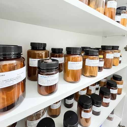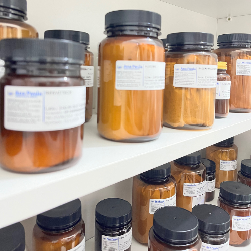 As matérias-primas são cuidadosamente conferidas ao chegarem e armazenadas em quarentena. Após a aprovação do controle de qualidade, elas são organizadas em armários de forma prática e acessível, garantindo fácil identificação.
